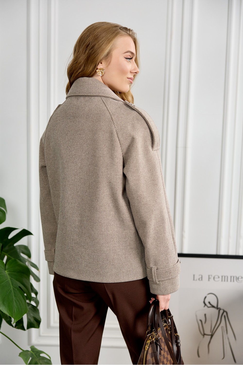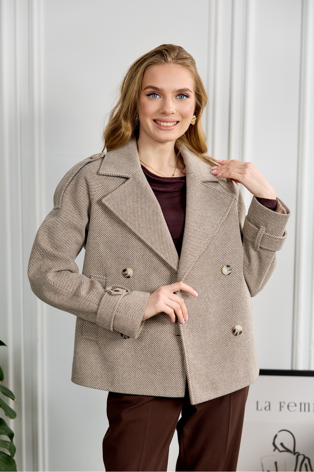 Укорочене пальто 531-01 беж в полоску
